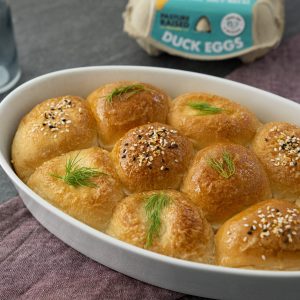- Brush butter on top of rolls. Sprinkle everything bagel seasoning on top of each roll.