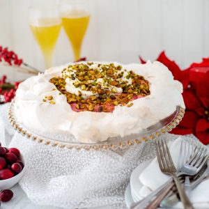Sweet and tart, cranberries make the perfect combination with Pavlova. We add a garnish of pistachios and mint, along with whipped cream.