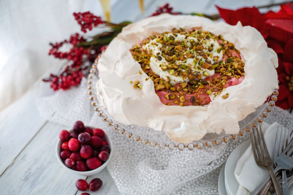 Sweet and tart, cranberries make the perfect combination with Pavlova. We add a garnish of pistachios and mint, along with whipped cream.