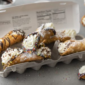 - Fill cannoli by squeezing filling into one end and then the other end. Sprinkle with topping of choice, we used crushed pistachios, chocolate shavings, and sprinkles.